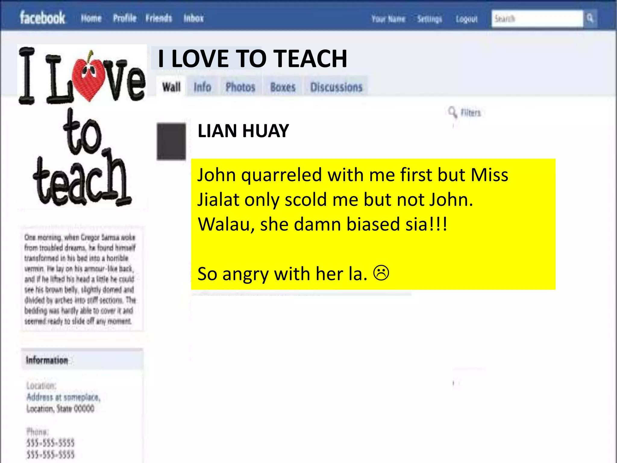 The document describes issues that students are facing with their math teacher, Ms. Jia. Multiple students complain that Ms. Jia shows favoritism, talks down to students, and rushes through lessons without ensuring student understanding. Suggestions are provided for Ms. Jia to employ more positive classroom management strategies, ensure fair treatment of all students, and differentiate instruction to engage various learning styles and abilities.