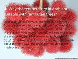 The document provides instructions for planting and caring for rambutan trees. It explains that rambutan seeds should be extracted from ripe fruit and germinated in soil or sawdust. Seedlings are then potted and grown in a nursery for 8-12 months before being transplanted. Rambutan trees have fibrous roots, unlike cacti which store water in their stems. Proper watering and drainage is needed, especially during dry seasons. Rambutan trees grow best in deep, organic-rich soil spaced 10-12 meters apart in a tropical climate with temperatures between 22-35°C and rainfall of 2000-3000mm annually.