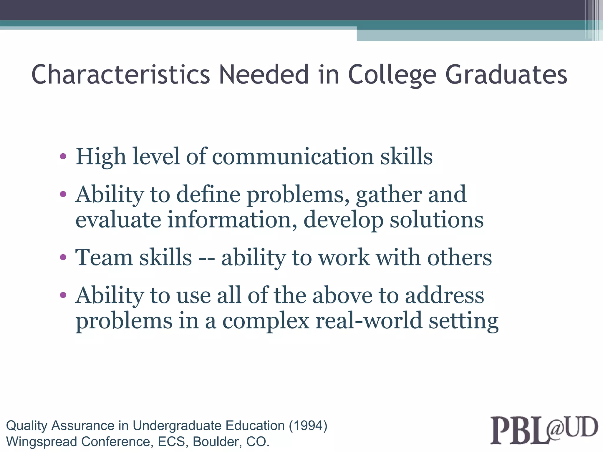 Problem-based learning (PBL) begins with students working in groups to solve an authentic, complex, real-world problem. Students identify what they need to know to solve the problem through self-directed learning. The process enhances retention through exploration, invention, and application of concepts. PBL contrasts with traditional, subject-based learning by applying knowledge to solve problems rather than first learning concepts separately. Effective PBL balances learning objectives and assessment of both content mastery and soft skills like teamwork and problem-solving.