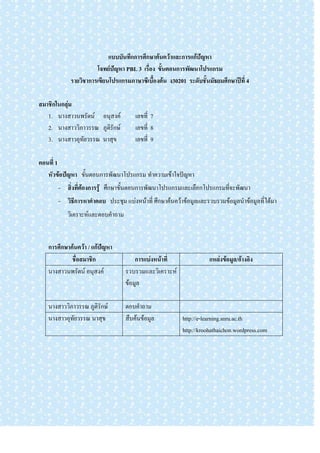 โจทย์ปัญหา PBL 3 เรื่อง ขั้นตอนการพัฒนาโปรแกรม รายวิชาการเขียนโปรแกรมภาษาซีเบื้องต้น ง30201 ระดับชั้นมัธยมศึกษาปีที่ 4 สมาชิกในกลุ่ม 1. นางสาวนพรัตน์ อนุสงค์ เลขที่ 7 2. นางสาววิภาวรรณ ภูติรักษ์ เลขที่ 8 3. นางสาวอุทัยวรรณ นาสุข เลขที่ 9 ตอนที่ 1 หัวข้อปัญหา ขั้นตอนการพัฒนาโปรแกรม ทาความเข้าใจปัญหา - สิ่งที่ต้องการรู้ ศึกษาขั้นตอนการพัฒนาโปรแกรมและเลือกโปรแกรมที่จะพัฒนา - วิธีการหาคาตอบ ประชุม แบ่งหน้าที่ ศึกษาค้นคว้าข้อมูลและรวบรวมข้อมูลนาข้อมูลที่ได้มา วิเคราะห์และตอบคาถาม การศึกษาค้นคว้า / แก้ปัญหา ชื่อสมาชิก การแบ่งหน้าที่ แหล่งข้อมูล/อ้างอิง นางสาวนพรัตน์ อนุสงค์ รวบรวมและวิเคราะห์ ข้อมูล นางสาววิภาวรรณ ภูติรักษ์ ตอบคาถาม นางสาวอุทัยวรรณ นาสุข สืบค้นข้อมูล http://e-learning.snru.ac.th http://kroohathaichon.wordpress.com