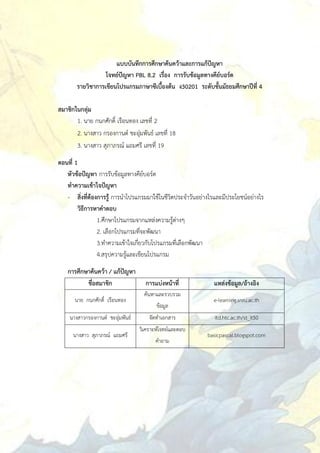 โจทย์ปัญหา PBL 8.2 เรื่อง การรับข้อมูลทางคีย์บอร์ด รายวิชาการเขียนโปรแกรมภาษาซีเบื้องต้น ง30201 ระดับชั้นมัธยมศึกษาปีที่ 4 สมาชิกในกลุ่ม 1. นาย กนกศักดิ์ เรือนทอง เลขที่ 2 2. นางสาว กรองกานต์ ชะอุ่มพันธ์ เลขที่ 18 3. นางสาว สุภาภรณ์ แถมศรี เลขที่ 19 ตอนที่ 1 หัวข้อปัญหา การรับข้อมูลทางคีย์บอร์ด ทาความเข้าใจปัญหา - สิ่งที่ต้องการรู้ การนาโปรแกรมมาใช้ในชีวิตประจาวันอย่างไรและมีประโยชน์อย่างไร วิธีการหาคาตอบ 1.ศึกษาโปรแกรมจากแหล่งความรู้ต่างๆ 2. เลือกโปรแกรมที่จะพัฒนา 3.ทาความเข้าใจเกี่ยวกับโปรแกรมที่เลือกพัฒนา 4.สรุปความรู้และเขียนโปรแกรม การศึกษาค้นคว้า / แก้ปัญหา ชื่อสมาชิก การแบ่งหน้าที่ แหล่งข้อมูล/อ้างอิง ค้นหาและรวบรวม นาย กนกศักดิ์ เรือนทอง e-learning.snru.ac.th ข้อมูล นางสาวกรองกานต์ ชะอุ่มพันธ์ จัดทาเอกสาร itd.htc.ac.th/st_it50 วิเคราะห์โจทย์และตอบ นางสาว สุภาภรณ์ แถมศรี basicpascal.blogspot.com คาถาม