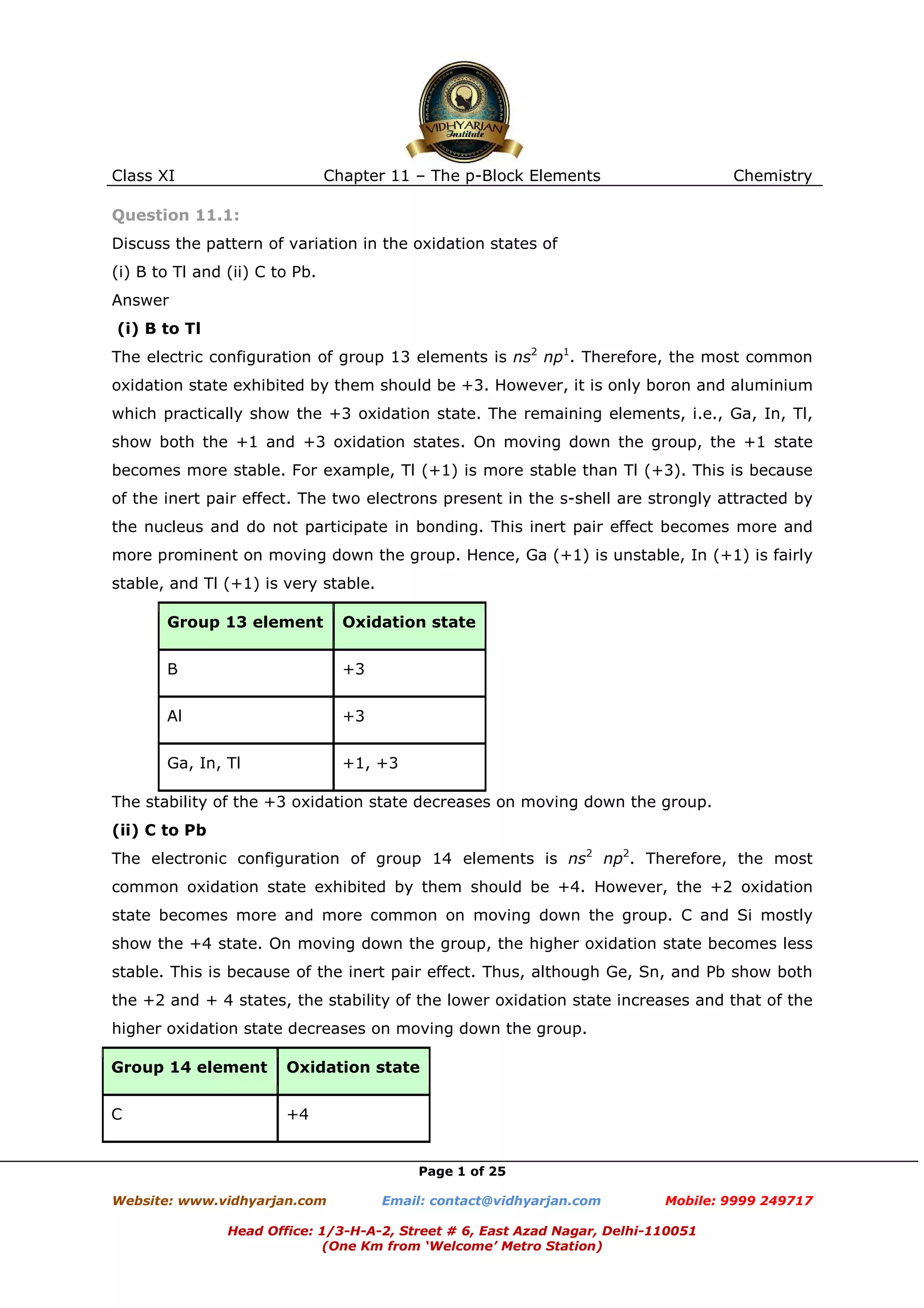 The document discusses the oxidation states of elements in groups 13 and 14 of the periodic table. It notes that the +3 oxidation state is most common for group 13 but becomes less stable down the group due to the inert pair effect. For group 14, the +4 state is most common for carbon and silicon but the +2 state becomes more stable down the group also due to the inert pair effect. The document also contains sample questions and answers regarding the structures, properties, and reactions of boron- and carbon-containing compounds.