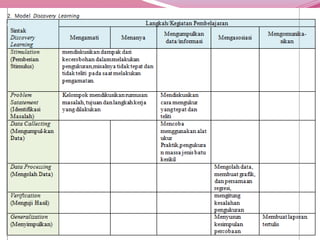 Discovery learning adalah metode pembelajaran yang mendorong siswa untuk aktif dalam mengorganisasi dan menemukan informasi melalui serangkaian proses. Metode ini memiliki kelebihan dalam meningkatkan keterampilan kognitif dan partisipasi siswa, namun juga memiliki kelemahan seperti tantangan bagi siswa yang kesulitan dalam pemahaman abstrak. Terdapat tiga jenis discovery learning menurut Jerome Bruner, yaitu penemuan murni, terbimbing, dan laboratorium.
