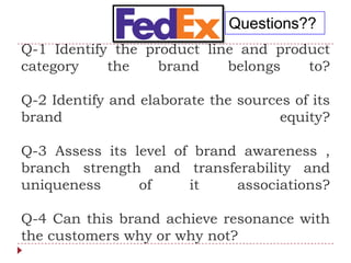 FedEx is a global logistics company that provides shipping and business services. It has strong brand equity from its recognizable name, long-running advertising campaigns focused on on-time delivery, and ability to ship packages worldwide quickly and reliably. FedEx has high brand awareness, with customers strongly associating it with fast, dependable shipping services. Its consistent messaging around priorities like customer service and timeliness help it achieve brand resonance with customers.