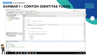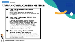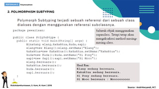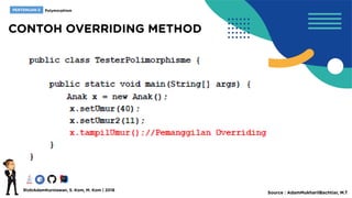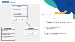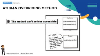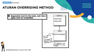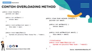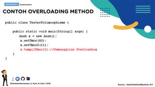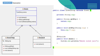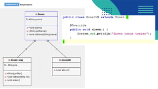 Dokumen menjelaskan konsep polimorfisme dalam pemrograman berorientasi objek, termasuk overloading dan overriding method. Selain itu, terdapat instruksi untuk membuat program berdasarkan diagram kelas tertentu yang melibatkan kelas manusia, dosen, dan mahasiswa, serta perhitungan gaji dengan tunjangan. Pengguna diminta untuk mengimplementasikan kode sesuai ketentuan yang disertakan dan mengupload hasilnya ke GitHub.