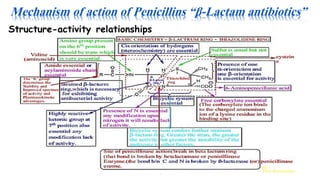 This document discusses penicillin-binding protein 2a (pbp2a) and its role in bacterial cell wall synthesis and antibiotic resistance. It outlines the mechanisms of action for β-lactam antibiotics, specifically penicillin, detailing their bactericidal and bacteriostatic effects, as well as the strategies bacteria use to resist these antibiotics. Additionally, it highlights the structure-activity relationship of penicillins and methods to combat resistance, including the modification of β-lactam structures and the use of β-lactamase inhibitors.
