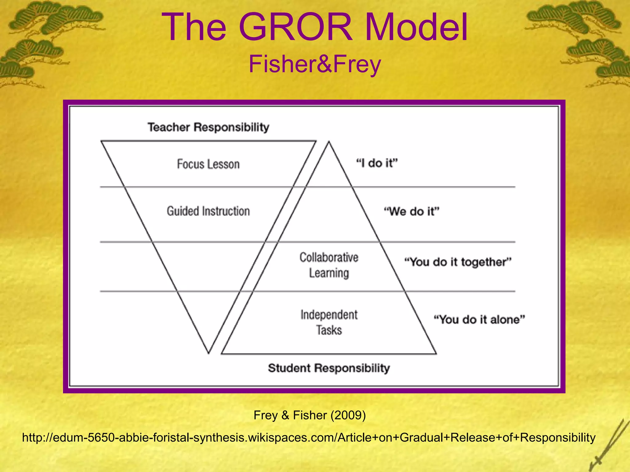 This document outlines a lesson plan using the Gradual Release of Responsibility Model to teach literary analysis. Over two to three days, students will analyze the unique writing styles of authors like Hemingway and Faulkner. The teacher will use focused instruction, guided practice, collaborative work, and independent tasks. Formative assessments include student modeling, feedback, and a rubric. The goal is for students to understand how an author's style reflects the historical context and themes of their work.