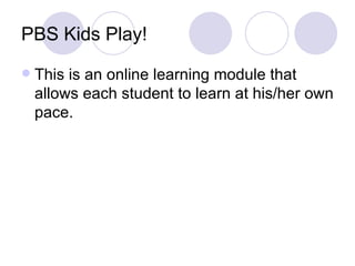 This document summarizes an online learning module called PBS Kids Play. It allows students to learn curriculum like creativity, health, language, literacy, math, science, and social studies at their own pace. The curriculum brings 21st century skills like creativity, critical thinking, and technology. Teachers can monitor student progress and assign activities by easy to hard levels and subject categories. PBS Kids Play is meant to supplement the daily curriculum as an additional learning tool.