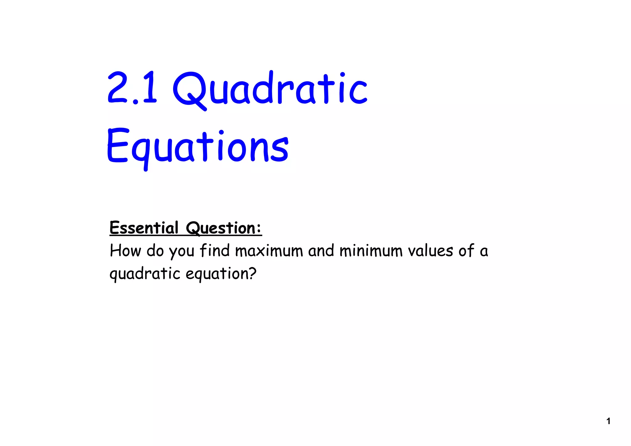 This document defines quadratic equations as polynomial functions of degree 2, where the highest exponent is 2. It explains that a quadratic equation can be written in standard form as f(x) = ax^2 + bx + c, where a, b, and c are real numbers and a is not equal to 0. The graph of a quadratic equation is a parabola. Key features of a parabola include its axis of symmetry, which is the line that bisects the parabola, and its vertex, which is the highest or lowest point of the parabola. The document provides examples of finding the vertex and axis of symmetry of parabolas given their equations and of writing the equation of a parabola