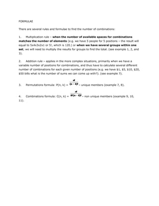 The document provides an overview of combinatorics problems that may appear on the GMAT. It discusses the different levels of difficulty, from easy one-action problems to harder problems involving calculations or multiple limitations. The key is to identify the correct solution method rather than getting bogged down in calculations. Several examples of combinatorics problems are provided and solved using logical reasoning rather than formulas. Common formulas for permutations and combinations are also listed.