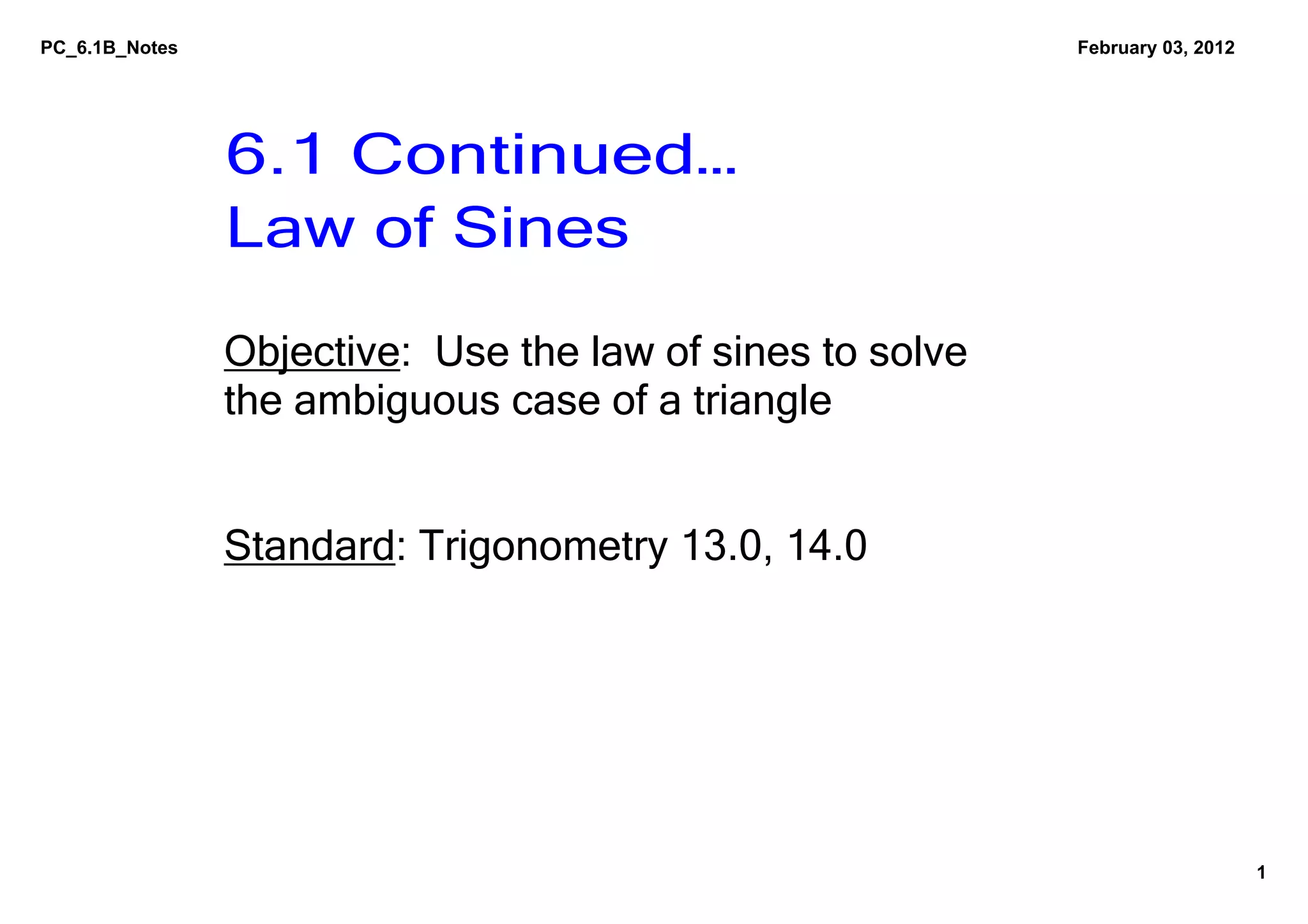 This document discusses using the Law of Sines to solve ambiguous triangle cases given two sides and a non-included angle (SSA). There can be 1, 2, or 0 solutions depending on whether the opposite side is greater than or less than the adjacent side. Examples are provided to practice solving SSA cases using the Law of Sines. Students are assigned a worksheet to practice solving ambiguous triangle cases.