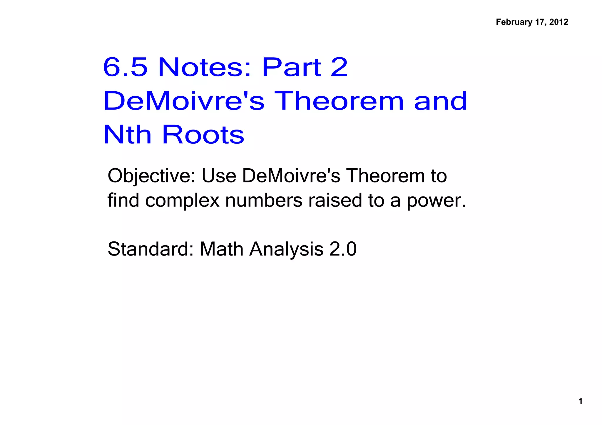 This document is a set of lecture notes on using DeMoivre's Theorem to find complex numbers raised to a power. It reviews trigonometric form, multiplying and dividing complex numbers, and introduces DeMoivre's Theorem. It provides examples of using the theorem to evaluate complex numbers to various powers. It also discusses finding nth roots of numbers and provides examples of solving nth root equations. The document concludes with assigning practice problems from the textbook.