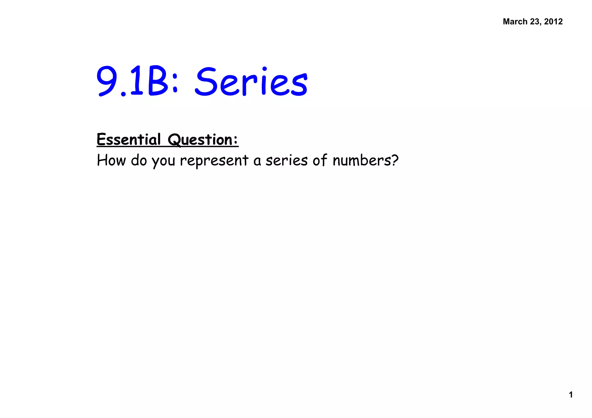 The document discusses representing series of numbers through summation notation. It explains that a series can be either finite, with a set number of terms, or infinite, with an unlimited number of terms. Examples are provided to demonstrate calculating partial sums and full sums of series. Properties of series are outlined. Students are assigned problems from the textbook to practice finding sums of different finite and infinite series.