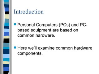 The document discusses the key internal and external components of a personal computer (PC). It identifies external components like the case, monitor, keyboard, and mouse. It then describes important internal components such as the motherboard, central processing unit (CPU), drives, expansion cards, memory, and power supply. The document provides details on how these components work and their functions within the PC.