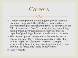 This document provides information on various aspects of the setting of High Skies, a steampunk world. It discusses careers requiring licenses, challenges of travel between islands due to lack of infrastructure, the important minerals that power their society (floatstone and sinkstone), the political situation under the Crown Prime alliance, the importance of new technology and inventions, and the rarity of traditional magic in a world where magic is controlled by the wealthy.