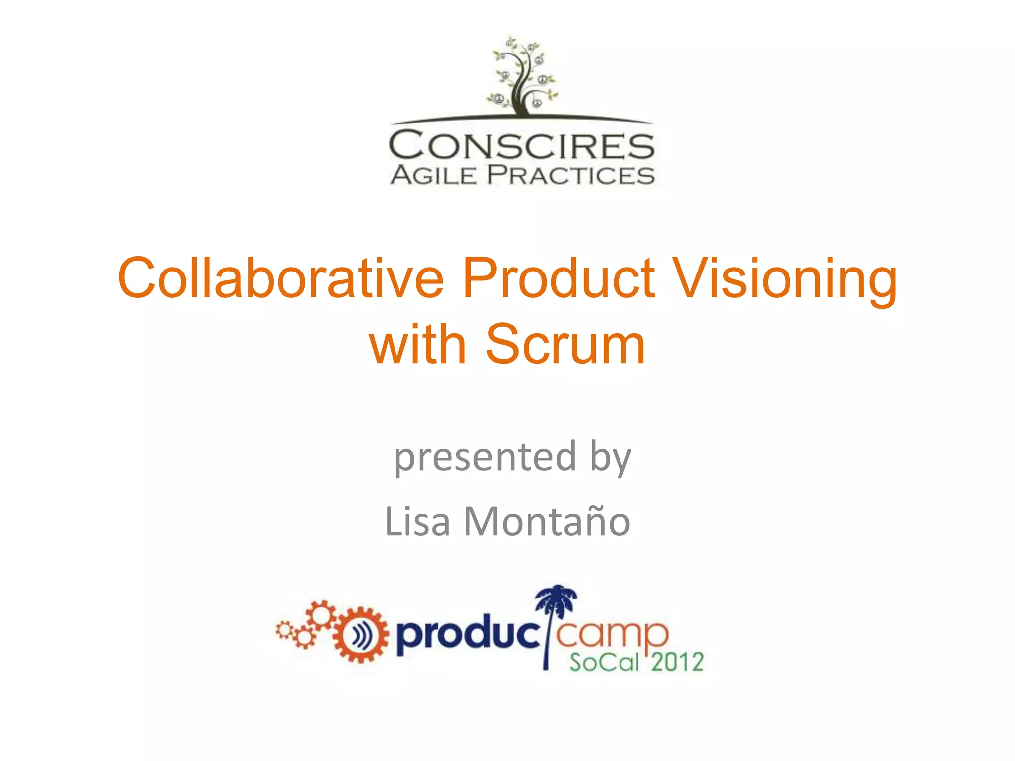 This document discusses collaborative product visioning using Scrum principles. It describes creating personas and defining customer needs to inspire team innovation. Teams understand business drivers and are freed to innovate. The product vision board brings together personas, needs, features, vision, and value proposition. Challenges to collaboration can be overcome by establishing success, beginning with proofs of concept, focusing on customer needs, and socializing emergent development.