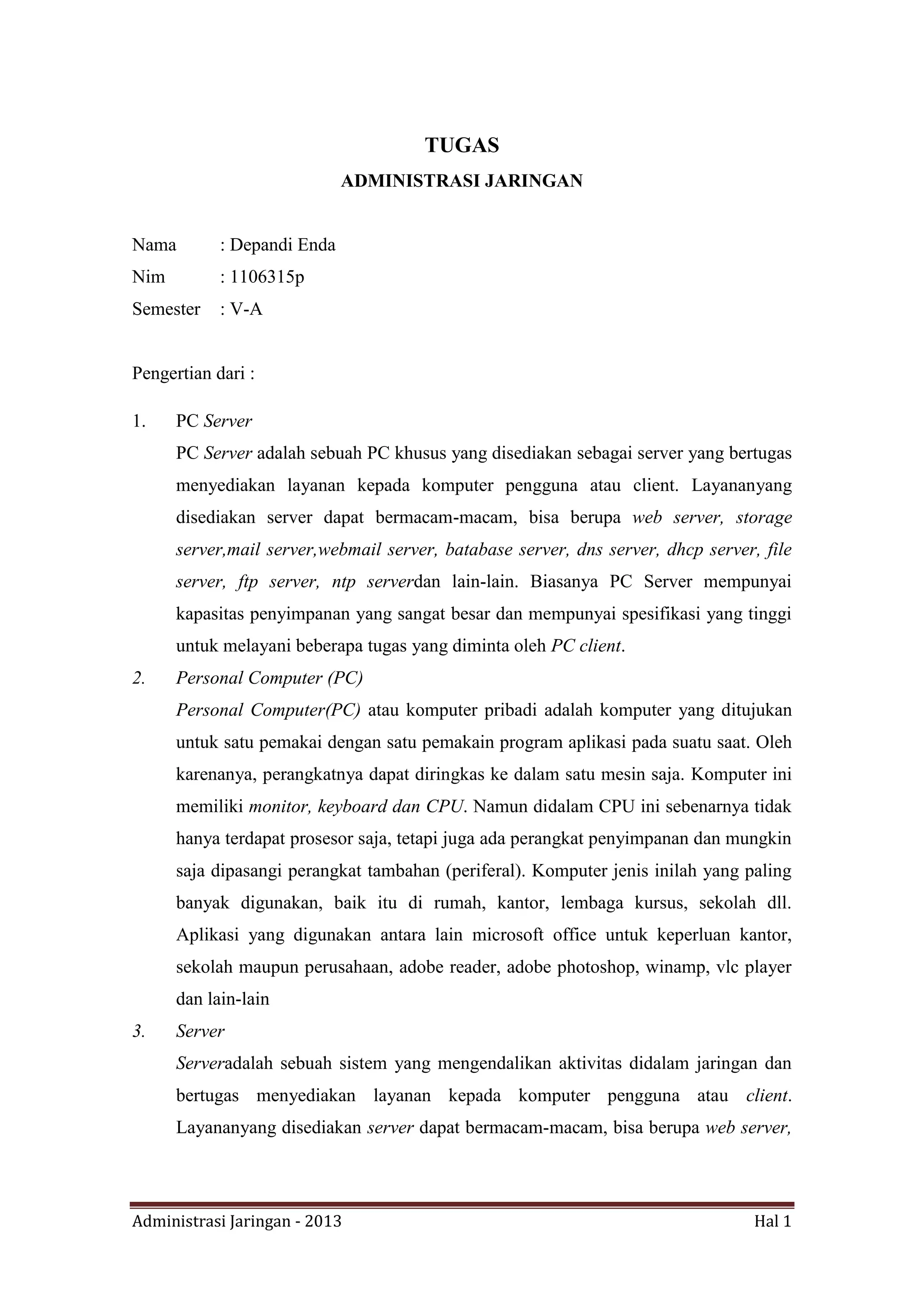Dokumen ini membahas pengertian tentang PC Server, Personal Computer, Server, Tablet, Notebook, dan Laptop. PC Server digunakan untuk menyediakan berbagai layanan kepada komputer-komputer lain dan memiliki spesifikasi tinggi. Personal Computer adalah komputer pribadi untuk satu pengguna. Server bertugas menyediakan layanan kepada komputer lain. Tablet, Notebook, dan Laptop adalah komputer portabel dengan ukuran berbeda.