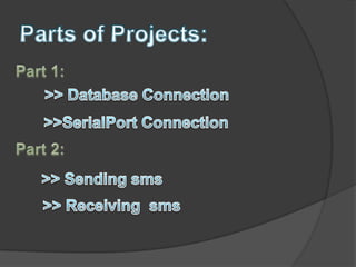 This document summarizes a software development project involving database and serial port connections, SMS sending and receiving, and voice and file transfer capabilities. The project was developed by Bikash Chandra Karmokar and Tanmoy Shaha and supervised by Dr. K.M. Azharul Hasan. It connects to a database, finds available serial ports, and allows sending and receiving SMS messages between a PC and mobile device. The project also aims to enable voice chat, file transfer, and image transfer between devices using Java programming languages and image editing software.