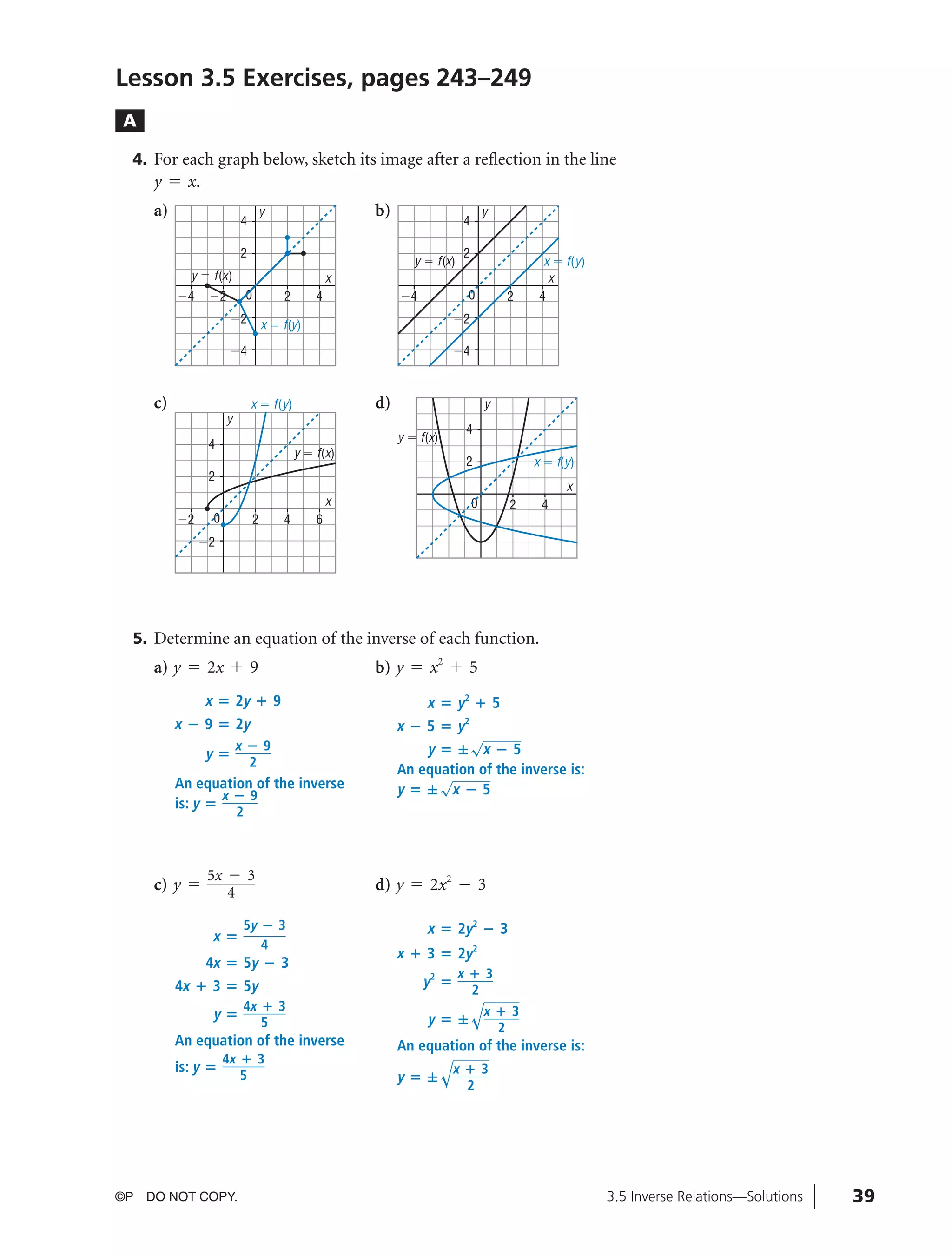 This document contains solutions to exercises from a pre-calculus textbook involving inverse functions and relations. Some of the key questions answered include: