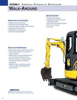 The PC35MR-3 compact hydraulic excavator has an operating weight of 3595 kg/7,909 lb and is powered by a 21.4 kW/29 HP Komatsu engine. It has a maximum digging depth of 3455 mm/11'4" and can travel at speeds up to 4.8 km/hr. Standard features include auxiliary hydraulics, a suspension seat, and a two-speed travel system.