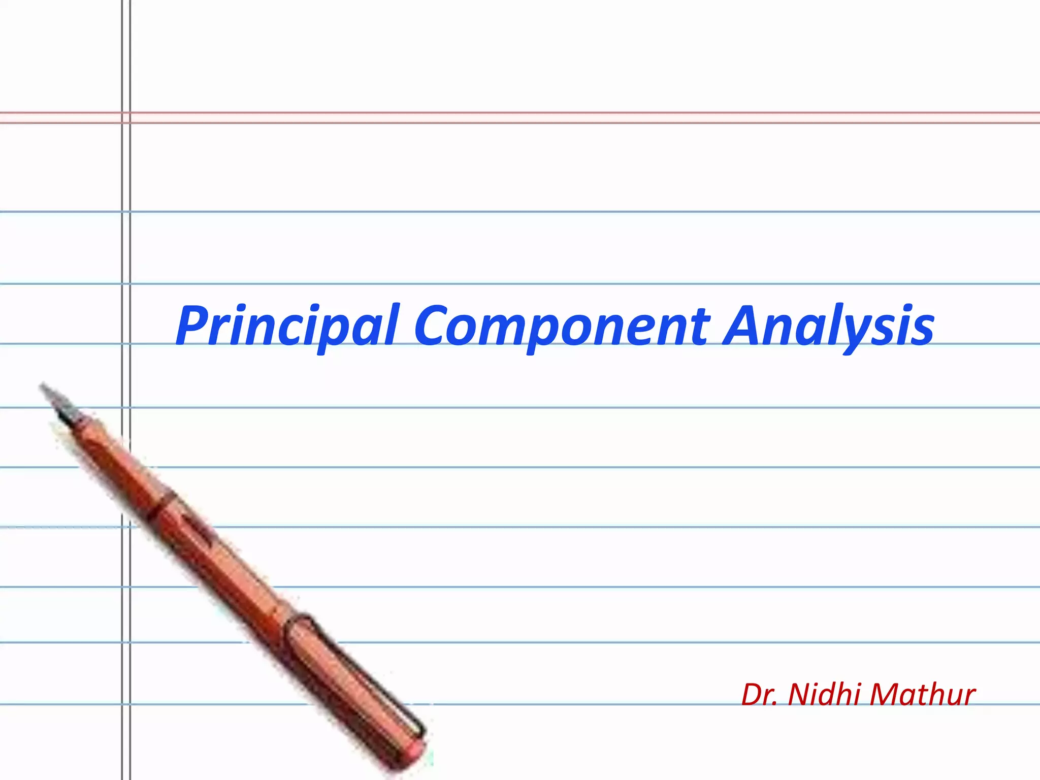 Principal Component Analysis (PCA) is a technique used to simplify complex data sets by identifying patterns in the data and expressing it in such a way to highlight similarities and differences. It works by subtracting the mean from the data, calculating the covariance matrix, and determining the eigenvectors and eigenvalues to form a feature vector representing the data in a lower dimensional space. PCA can be used to represent image data as a one dimensional vector by stacking the pixel rows of an image and applying this analysis to multiple images.