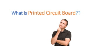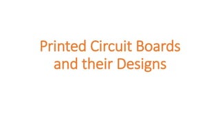 Printed circuit boards (PCBs) are boards that mechanically support and electrically connect electronic components using conductive tracks etched onto a non-conductive substrate. The PCB design process involves schematic capture, schematic design, component placement, routing, generating fabrication files, and fabrication. PCBs can have multiple layers to minimize size and accommodate many connections. PCB design tools are used to lay out components, route connections, and generate output files for fabrication.