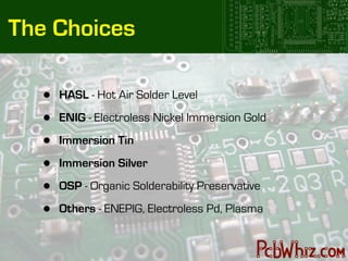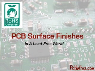 The document discusses various PCB surface finishes in a lead-free environment, including HASL, ENIG, IMSN, IMAG, and OSP, highlighting their advantages, disadvantages, and industry standards. It emphasizes factors influencing the choice of finishes such as cost, product volume, and reliability while addressing ongoing market trends and testing results. The conclusion indicates a need for further evaluation of surface finishes to optimize performance and cost-effectiveness in PCB manufacturing.