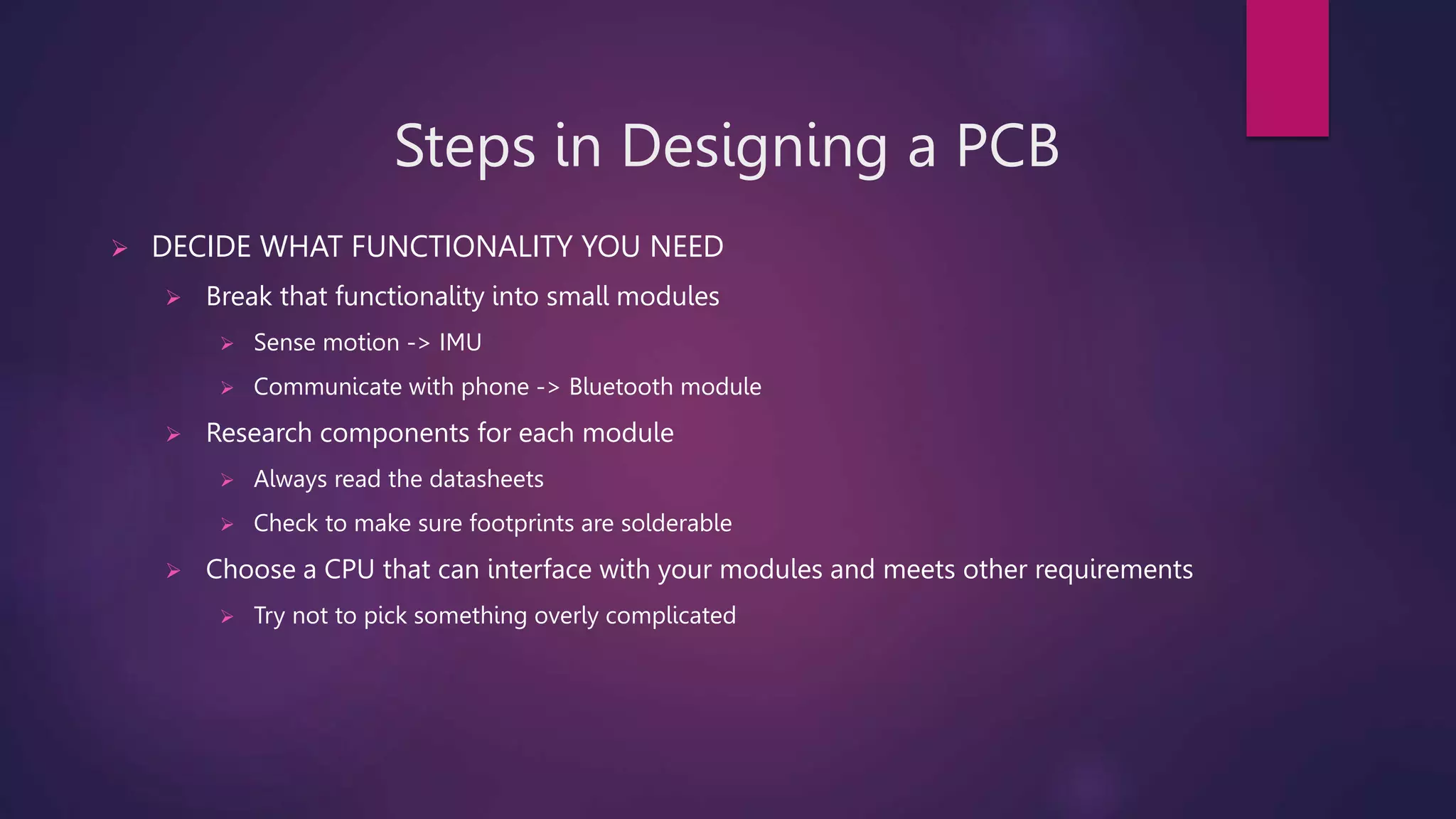 3) Designing the PCB layout by placing components, routing traces between them, and using techniques like polygon pours