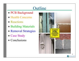 This document discusses PCBs (polychlorinated biphenyls) in building materials, which can be a health issue in schools. PCBs were commonly used in caulking and other building materials before 1977. Exposure to PCBs is linked to cancer and effects on the immune, reproductive and nervous systems. The document outlines steps for identifying PCB-containing materials, testing, exposure assessment, and remediation strategies like removal or barriers. Case studies show widespread PCB contamination found in caulking at schools, resulting in delays and high costs to address the problem. Proper testing and remediation is needed to reduce PCB exposure, especially in schools.