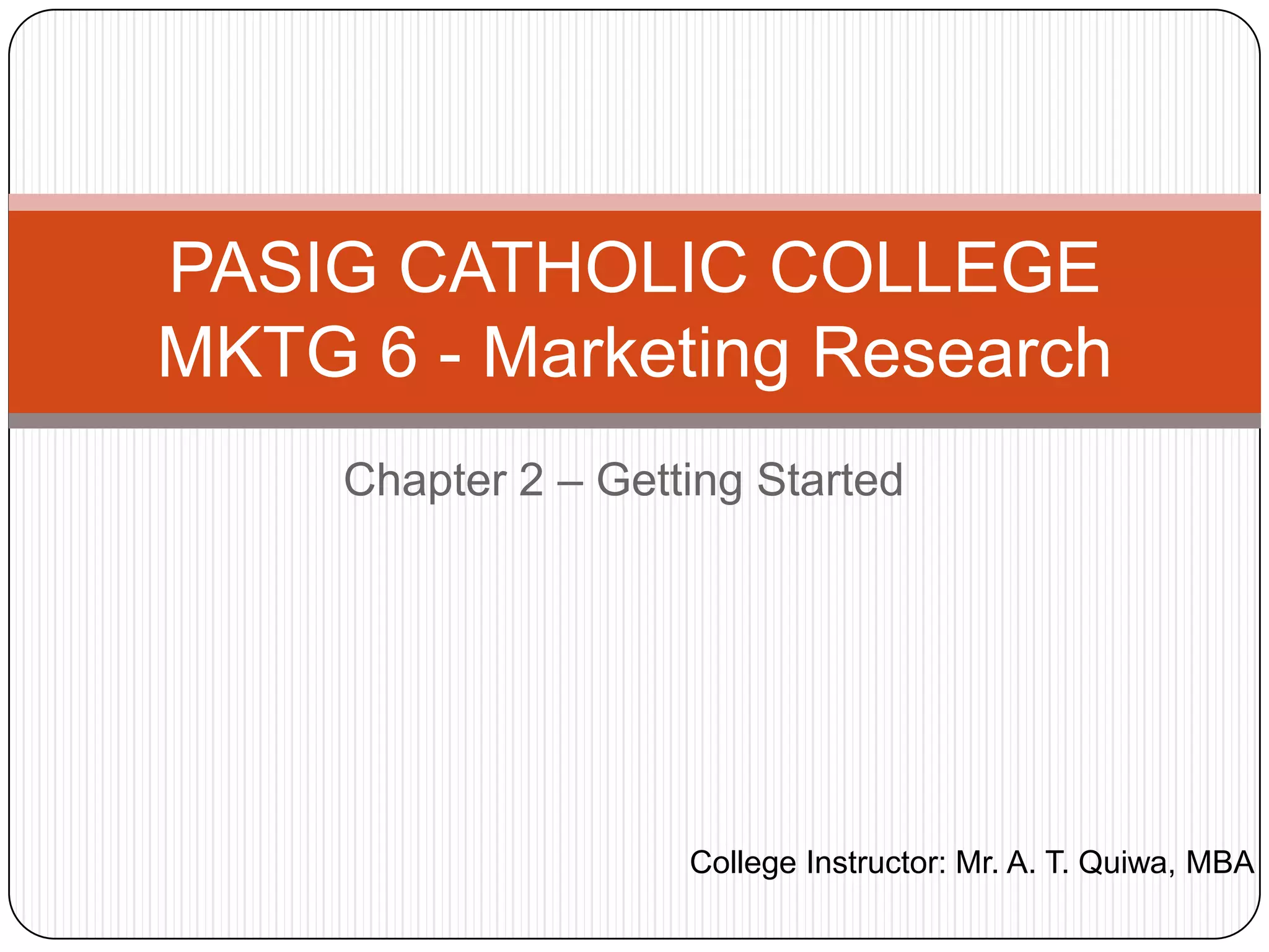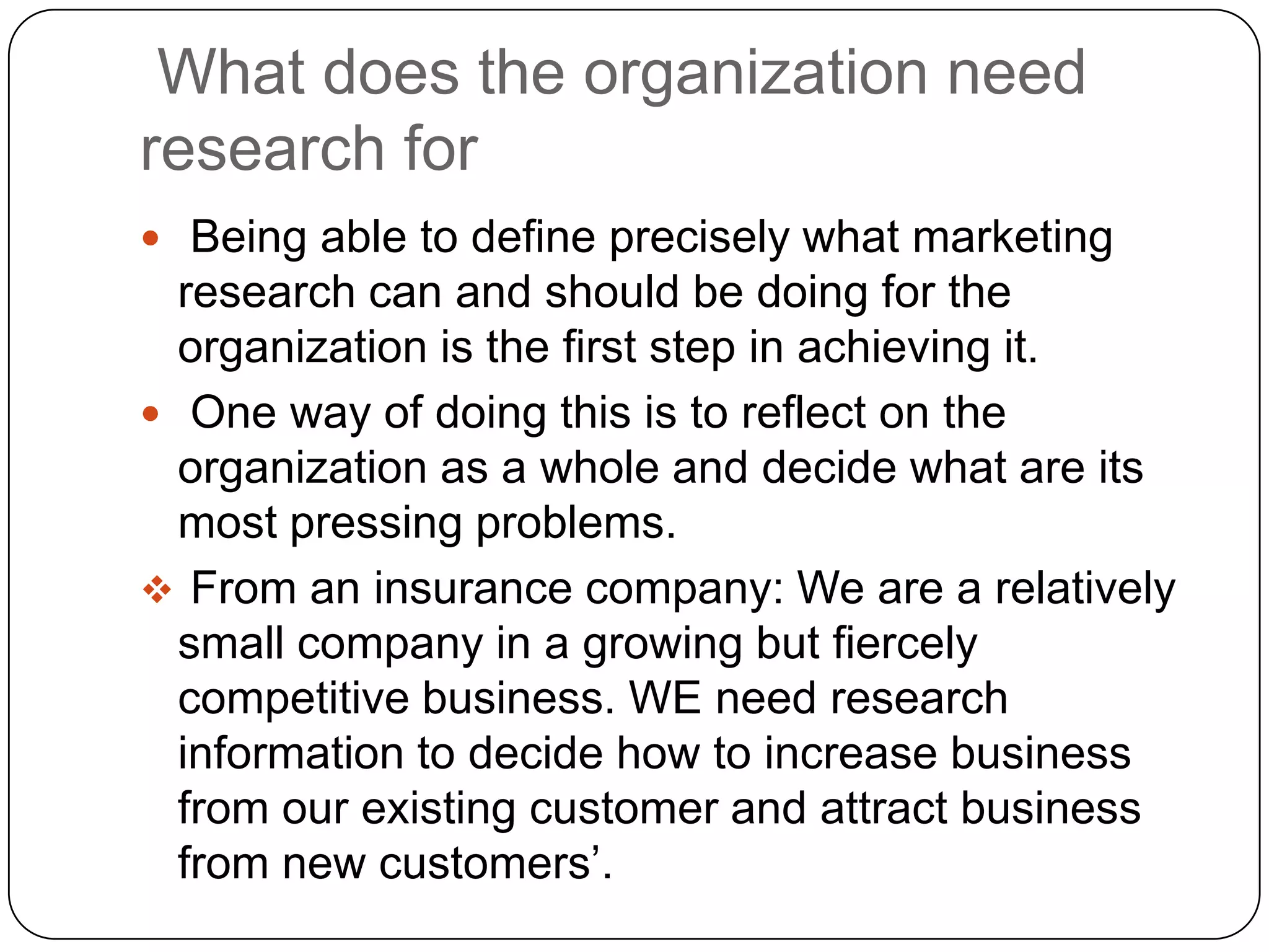 The document discusses how organizations can use marketing research to inform decision making. It outlines 6 types of research: continuous, ad hoc, desk, field, off-the-peg, and made-to-measure. Organizations should first define their research needs, then start with internal desk research before progressing to more specialized primary research that directly addresses their questions. Resources are required to acquire different types of research data, from basic filing systems to commissioned surveys.