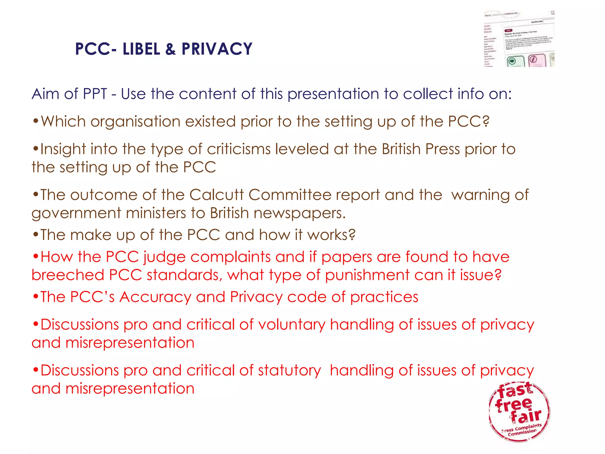 The document provides background information on the establishment of the Press Complaints Commission (PCC) in the UK. It details criticisms of press standards prior to the PCC around invasion of privacy and inaccurate reporting. It outlines the recommendations of the Calcutt Committee report for a new self-regulatory body. The PCC was then established in 1991 and operates independently to handle complaints. It resolves most issues informally but can publish critical adjudications of upheld complaints. The code covers accuracy and privacy, and the PCC claims self-regulation is preferable to statutory regulation. However, some critics argue the PCC does not adequately punish papers or prevent irresponsible reporting.