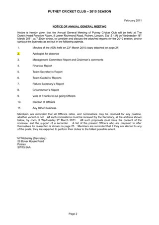 The 2010 annual report of Putney Cricket Club highlights a successful season with the Saturday 1st XI finishing as champions and the introduction to the Fullers Brewery Surrey County League. The club will hold its Annual General Meeting on March 16, 2011, to discuss reports, elect officers, and address club matters, while also facing changes in leadership roles. Financially, the club reported a reasonable surplus despite a decrease in membership and bar profits, and it plans various activities to enhance engagement and fundraising for the upcoming season.