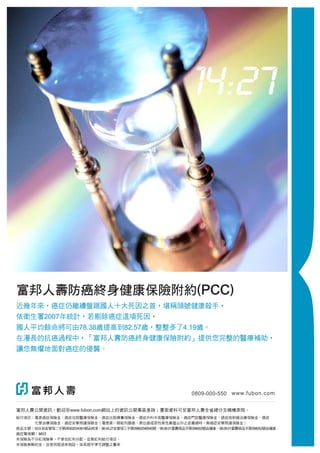 富邦人壽防癌終身健康保險附約(PCC) 近幾年來,癌症仍繼續盤踞國人十大死因之首,堪稱頭號健康殺手, 依衛生署2007年統計,若剔除癌症這項死因, 國人平均餘命將可由78.38歲提高到82.57歲,整整多了4.19歲。 在漫長的抗癌過程中,「富邦人壽防癌終身健康保險附約」提供您完整的醫療補助, 讓您無懼地面對癌症的侵襲。