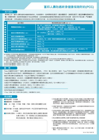 給付項目 每承保單位給付金額(註1、2) 第一至二十保單年度,經診斷確定罹患癌症:50,000元; 罹患癌症保險金(註3) 但第一期前列腺癌或原位癌:7,500元第二十一保單年度(含)起, 經診斷確定罹患癌症:75,000元;但第一期前列腺癌或原位癌:11,250元 第1~90日:1,200元/日 癌症住院醫療保險金(註4) 同一次住院之 第91日起:1,800元/日 癌症出院療養保險金 600元/日 癌症外科手術醫療保險金(註3/4) 15,000元/次,但第一期前列腺癌或原位癌:2,250元/次 癌症門診醫療保險金(註5) 500元/日 癌症放射線治療保險金(註6) 500元/日 癌症化學治療保險金(註6) 800元/日 癌症安寧照護保險金 確診癌症後的第1、2、3、4、5個罹癌確定日之周年日仍生存:20,000元/年 但第一期前列腺癌、原位癌或惡性黑色素瘤以外之皮膚癌:無 註1.被保險人於本附約定義之觀察期間屆滿前,已經診斷確定罹患癌症者,本公司不負給付保險金之責,本附約對該被保險人自始不生效力。被保險人於觀察期間屆滿前,已為 切片或血液學檢查,於觀察期間屆滿後確定罹患癌症者,亦同。 註2.上列各項保險金每承保單位給付金額×承保單位數=各項保障項目之實際保障金額。 註3.被保險人所罹患者為第一期前列腺癌或原位癌時,本公司依「每承保單位給付金額」的15%及承保之單位數計算所得之金額給付之。 註4.因同一癌症或其引起的併發症,於出院後14天內再次住院時,其各種保險金之給付,視為同一次住院辦理。被保險人住院日數之計算,係按其實際住院日數(含住院及出院 當日)定之。但被保險人於出院當日再行住院者,當日住院日數以一日計算。 註5.每日門診次數無論一次或多次,均以一日計。 註6.每日治療次數無論一次或多次,均以一日計。 範 例 Tracy 25歲那年投保了「富邦人壽防癌終身健康保險附約」(PCC)個人型6單位。後來,Tracy不幸於40歲時,經診斷確定罹患原位癌, Tracy便於那年的3月及4月(期間間隔超過14天)住院30日接受治療,且於住院期間各接受了1次切除腫瘤的外科手術及1次以靜脈注射的 癌症化學治療5日後康復出院。Tracy共可獲得以下的保險給付~ 1.罹患癌症保險金:45,000元(於繳費期間內罹患原位癌7,500元×6單位)。 2.癌症住院醫療保險金:216,000元(1,200元/日×6單位×30日) 3.癌症外科手術醫療保險金:27,000元(於繳費期間內罹患原位癌2,250元/次×6單位×2次)。 4.癌症化學治療保險金:24,000元(800元/日×6單位×5日)。 5.癌症出院療養金:108,000元(600元/日×6單位×30日)。 合計NT$420,000元的保險給付 *Tracy(25歲/女性)投保PCC個人型6單位,年繳保費NT$11,856元 商品摘要 ■保險期間:至95歲 ◎本商品屬可調式平準保費:係指本公司針對已販售之本險全體有效保單 ,保有調整費率之權利,費率調整係依據本險實際理賠經驗計算,經主 ■繳費期間:同保險期間 管機關核准,並自公告三個月後之第一個保單週年日開始適用之,並適 用於所有首、續期之本附約有效保單。 ■繳 法:年繳、半年繳、季繳、月繳,須與主契約繳費方法相 同。 ◎本簡介僅供參考,詳細商品內容及變更,以投保當時保單條款內容及本 公司核保、保全作業等規定為準。 ■投保年齡:0~65歲;當附加於PHSI時,PCC投保年齡同PHSI為 1~60歲。 ◎本商品經富邦人壽合格簽署人員檢視其內容業已符合一般精算原則及保 險法令,惟為確保權益,基於保險公司與消費者衡平對等原則,消費者 ■投保單位限制:1~6單位;單位型癌症險於富邦人壽累計最高單 仍應詳加閱讀保險單條款與相關文件,審慎選擇保險商品。本商品如有 虛偽不實或違法情事,應由富邦人壽及負責人依法負責。 位應≦6單位;同一被保險人其日額型癌症險及 單位型癌症險,累計最高日額為8,000元。 ◎稅法相關規定或解釋之改變可能會影響本險之稅賦優惠。 ◎消費者於購買本商品前,應詳閱各種銷售文件,如要詳細了解本商品之 附加費用或其他相關資訊,請洽業務員、服務人員、服務中心(免費服 務及申訴電話:0809-000-550)或網站(網址:www.fubon.com),以保障 您的權益。 ◎富邦人壽保險股份有限公司 / 地址:台北市敦化南路一段108號14樓 / 電話:(02)8771-6699 98.08 商品行銷部 製