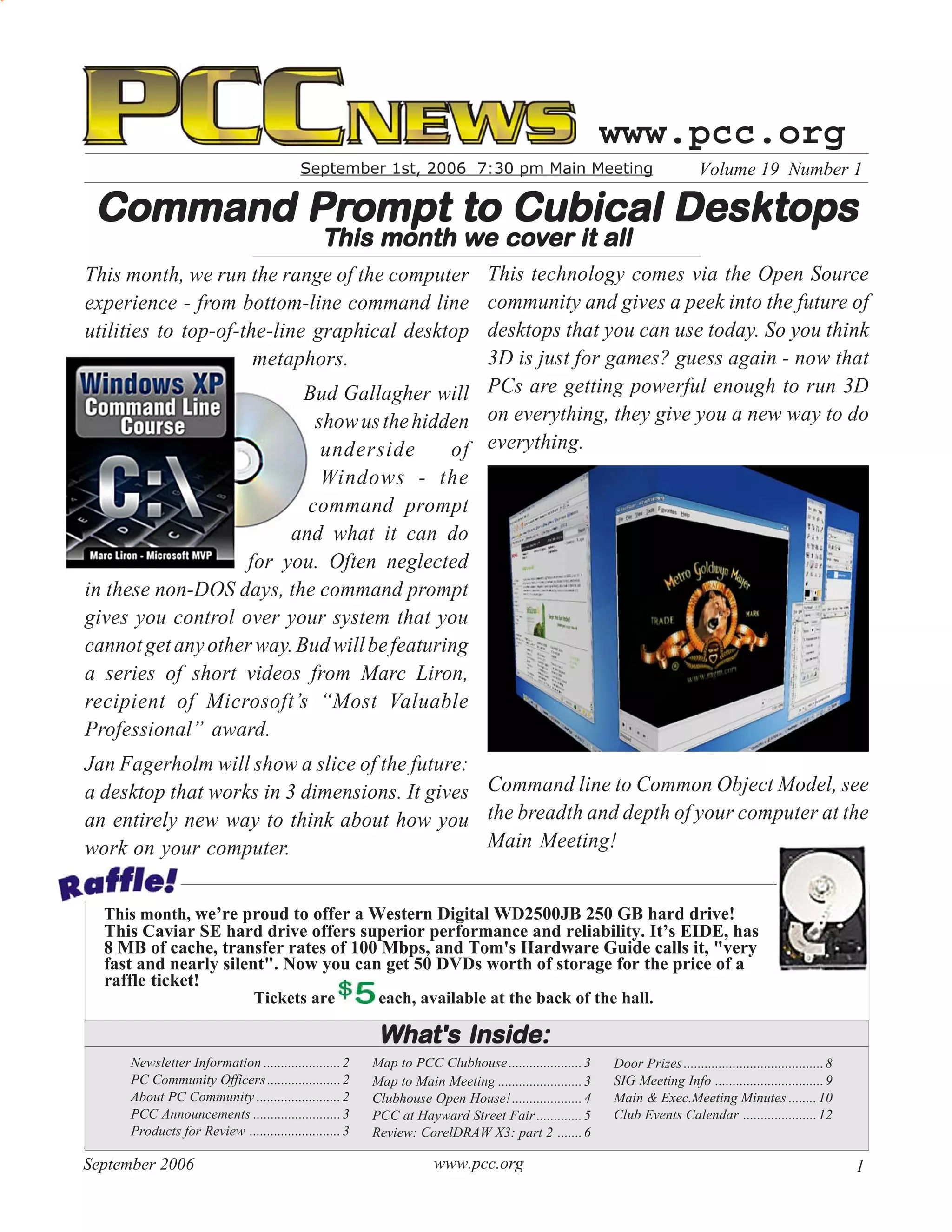 This month's PC Community meeting will feature presentations on both basic command line utilities and advanced 3D graphical desktop interfaces. Bud Gallagher will demonstrate the power of the Windows command prompt. Jan Fagerholm will showcase a 3D desktop of the future that allows a new way of interacting with computers. A raffle for a Western Digital hard drive will also be held.