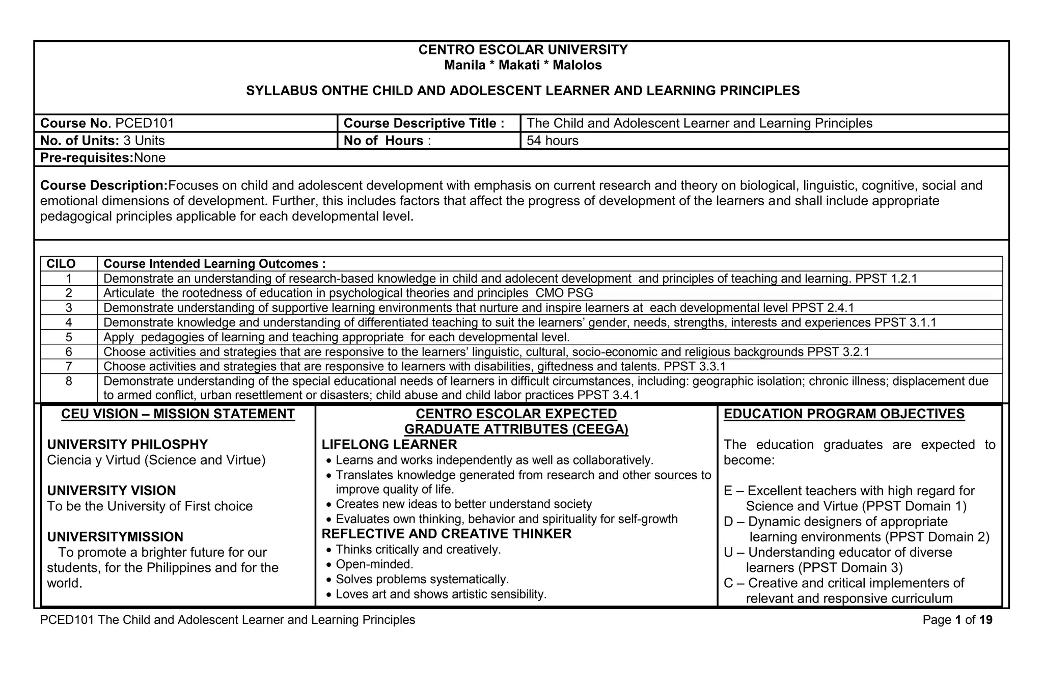 - The course intended learning outcomes include demonstrating understanding of research-based knowledge in child development, understanding supportive learning environments, and applying appropriate pedagogies for each developmental level.