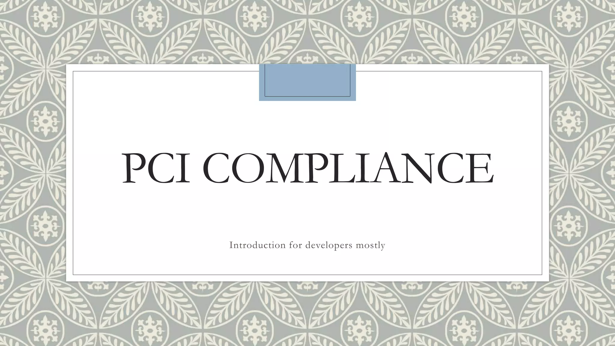 This document provides an overview of PCI compliance, emphasizing the protection of cardholder data and detailing the various standards for developers and merchants. It outlines best practices for handling sensitive data, requirements for encryption, and the consequences of non-compliance, such as financial fines and reputational damage. Additionally, it includes information on using PA-DSS to develop secure payment applications that ensure compliance with PCI standards.