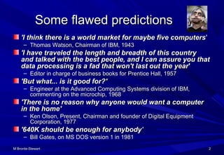 The document discusses several examples of flawed software predictions and failures over time. It then provides specific examples of notable software failures, including: