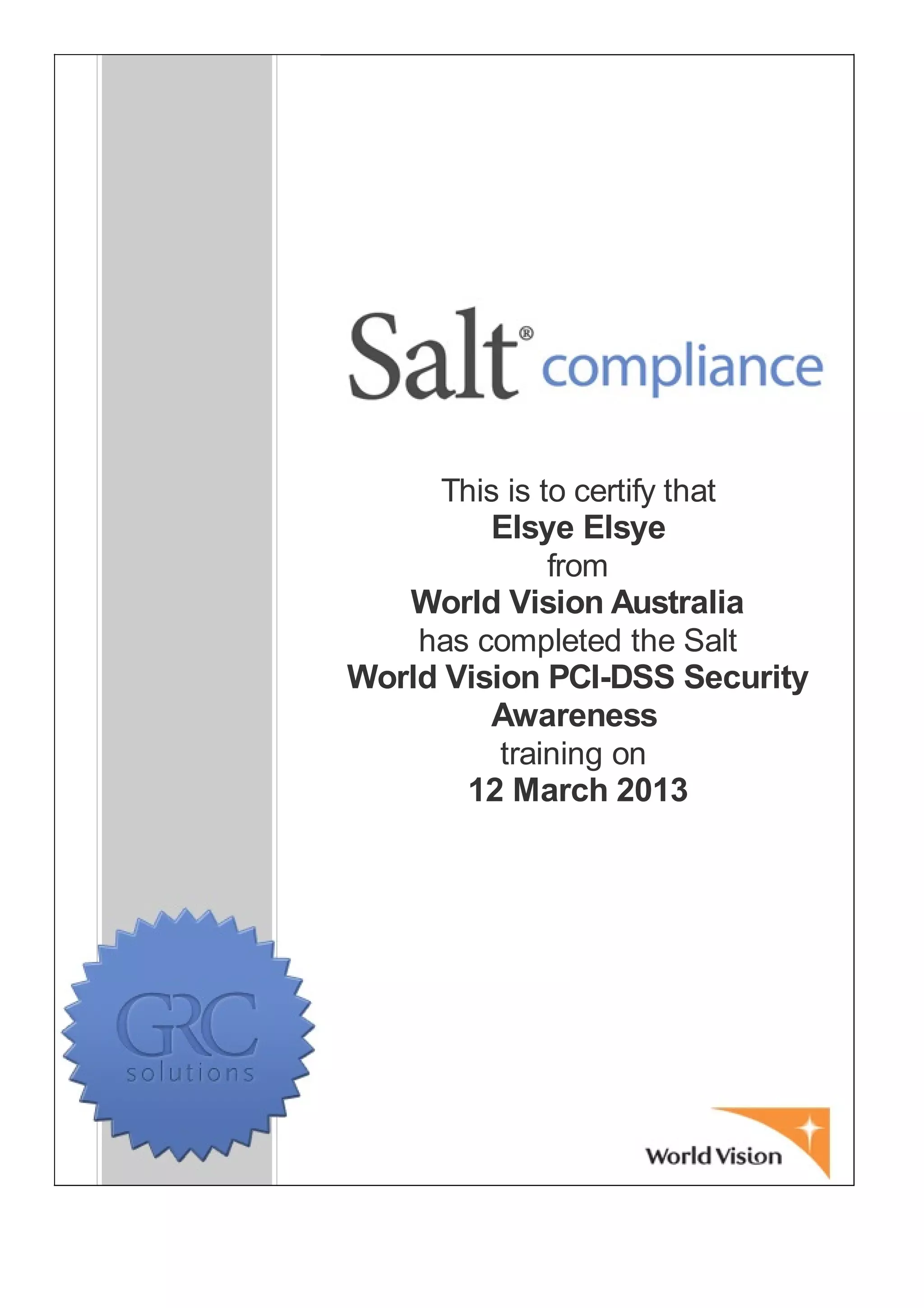 Elsye Elsye from World Vision Australia completed Salt World Vision PCI-DSS Security Awareness training on March 12, 2013 according to this certification document.