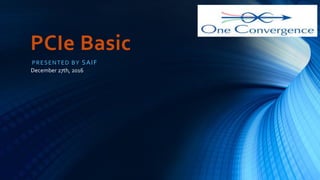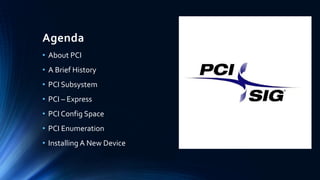 PCIe is a standard expansion card interface introduced in 2004 to replace PCI and PCI-X. It uses serial instead of parallel communication and is scalable, allowing for higher maximum system bandwidth. The presentation discusses the history of expansion card standards leading to PCIe, including ISA, EISA, VESA, PCI, and PCI-X. It also covers key aspects of PCIe such as the root complex, endpoints, switches, lanes, bus:device.function notation, enumeration, and address spaces such as configuration space.