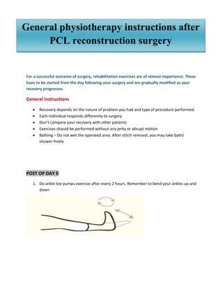 For a successful recovery from knee surgery, rehabilitation exercises must begin the day after surgery and be modified as recovery progresses. The post-op recovery plan outlined involves exercises like ankle pumps, leg raises, and isometrics to be done multiple times daily for the first few weeks. Exercises gradually progress to include walking, sitting, stair climbing, and strengthening workouts over 6 weeks. Patients are advised to follow the customized plan and understand recovery will differ for each individual.