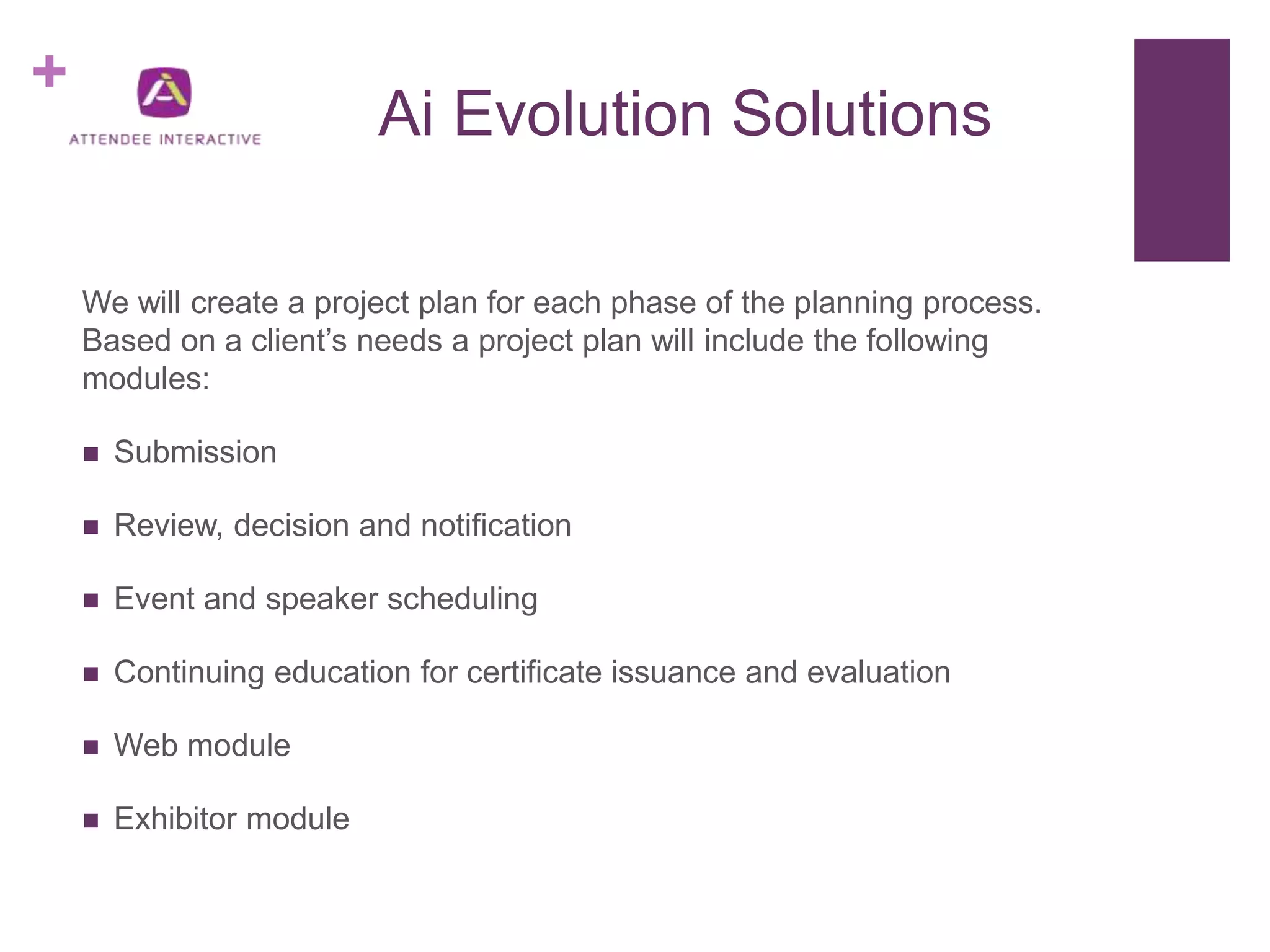 This document summarizes the modules and features available through Attendee Interactive's Ai Evolution conference planning software. It describes modules for submission and review, speaker management, continuing education credits, session building, an itinerary planner, a website, exhibitor management, e-posters, registration, and more. The software allows clients to create customized online solutions to manage all aspects of a conference from submission to evaluation.