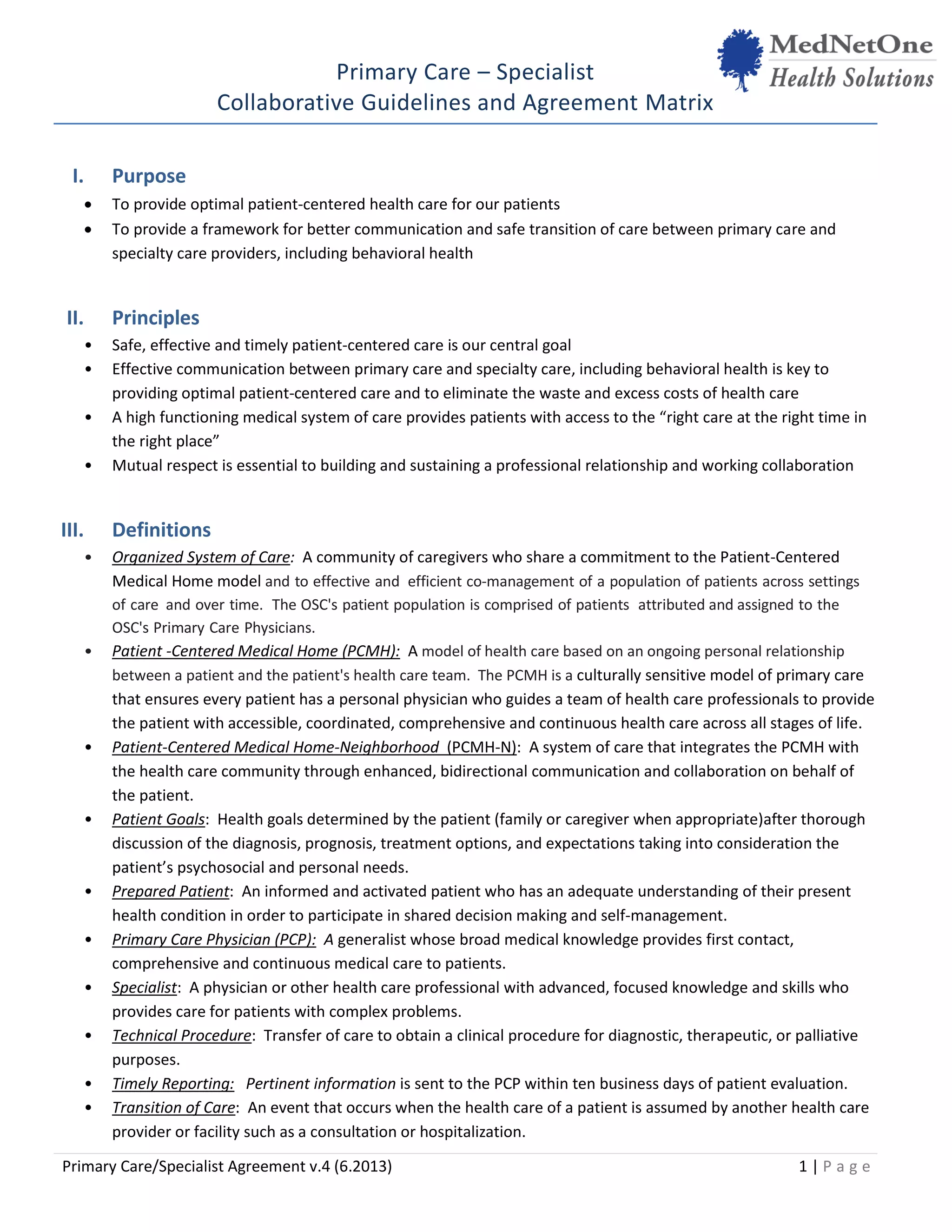 This document outlines guidelines for collaboration between primary care and specialty care providers to improve patient care. It defines key terms like patient-centered medical home and discusses different types of care transitions including pre-consultation, formal consultation, complete transfer of care, and co-management. The guidelines establish mutual agreements around maintaining accurate records, safe transfers of care, and adopting a referral system. It provides templates for primary care and specialty care expectations in areas like maintaining records, ordering tests, informing patients, and timely communication. The overall goal is to enhance communication and collaboration between providers through coordinated, patient-centered care.