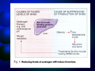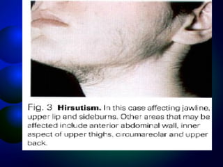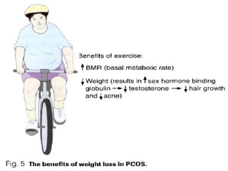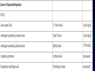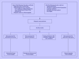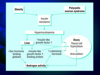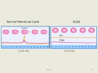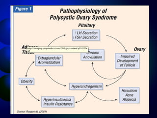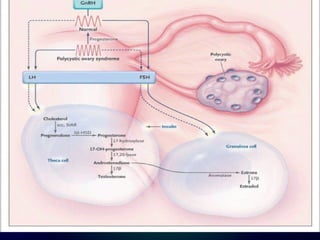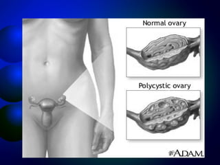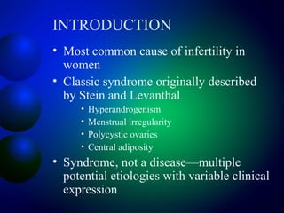 Polycystic Ovarian Syndrome (PCOS) is the most common cause of infertility in women. It is characterized by oligoamenorrhea, hyperandrogenism, and polycystic ovaries. PCOS results from abnormal pituitary-ovarian-adrenal interactions that cause excess androgen production and reduced fertility. Women with PCOS have an increased risk of insulin resistance, diabetes, heart disease, and obesity. The diagnosis of PCOS requires hyperandrogenism, ovarian dysfunction, and the exclusion of other disorders.