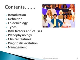 This presentation summarizes polycystic ovarian syndrome (PCOS). PCOS is a complex hormonal disorder common in women of reproductive age, characterized by enlarged ovaries with small cysts, irregular periods, and excess androgen. The presentation covers the definition, epidemiology, types, risk factors, pathophysiology, clinical features, diagnostic evaluation, management, and complications of PCOS. Key points include that PCOS can be inflammatory, post-pill, insulin resistance or adrenal-related, and treatment involves lifestyle changes, medication, and surgery depending on symptoms.