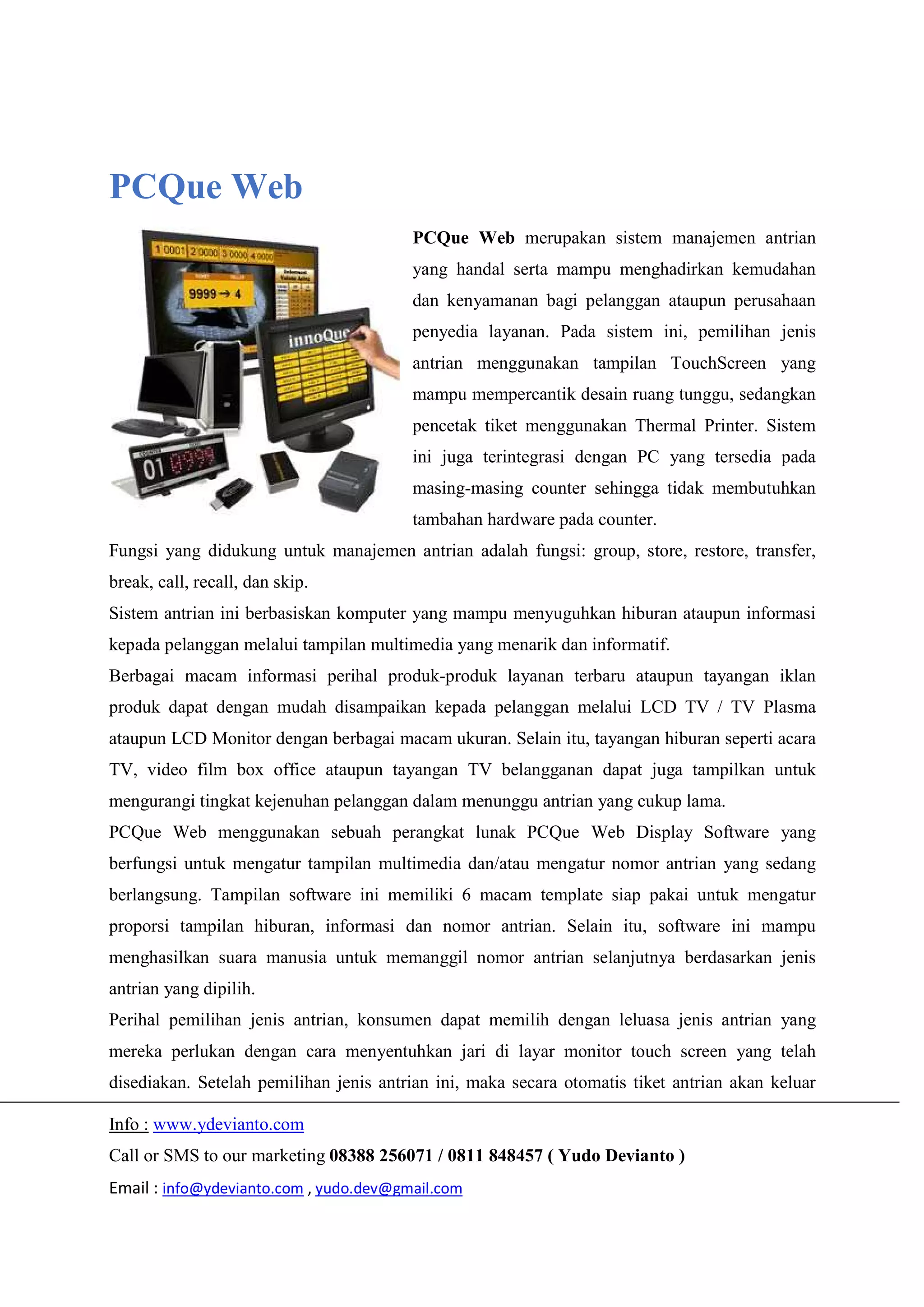 PCQue Web adalah sistem manajemen antrian yang menggunakan touchscreen untuk pemilihan layanan dan thermal printer untuk pencetakan tiket. Sistem ini dilengkapi dengan fitur multimedia untuk memberikan informasi dan hiburan kepada pelanggan di ruang tunggu, serta dapat mengelola berbagai jenis antrian melalui perangkat lunak yang terintegrasi. Selain itu, sistem ini mendukung berbagai fungsi manajemen antrian seperti group, store, dan recall untuk meningkatkan efisiensi pelayanan.