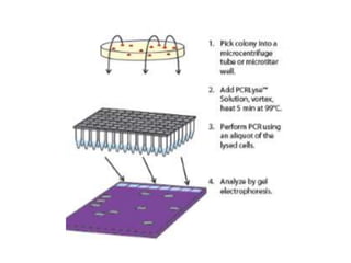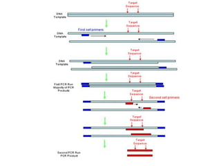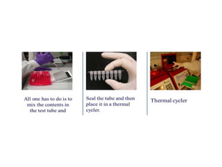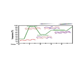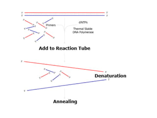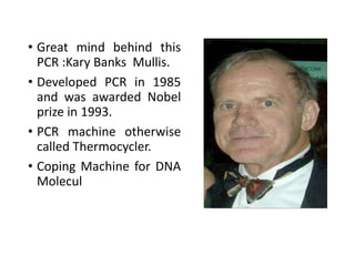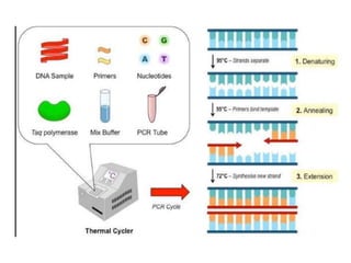PCR is a technique used to amplify a specific DNA sequence. It involves repeated cycles of heating and cooling of the DNA sample to separate and copy the DNA strands. Key components of PCR include primers, DNA polymerase, and dNTPs. Variations of PCR allow for applications such as detecting gene expression, sequencing DNA, and quantifying DNA. Limitations include errors during amplification and potential contamination issues.