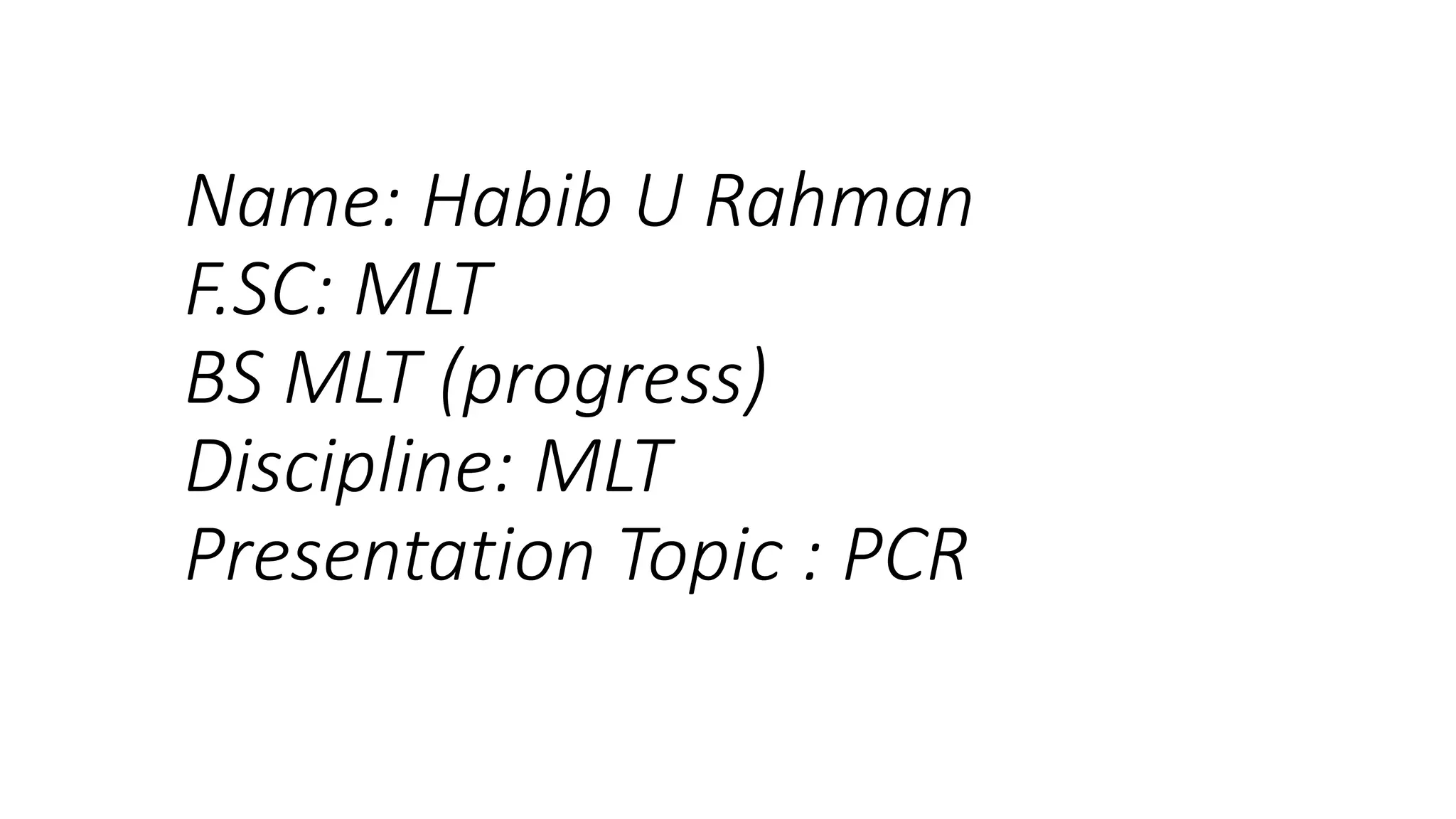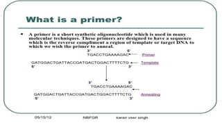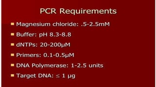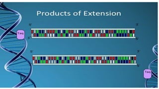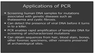 Habib U Rahman presents on PCR (polymerase chain reaction), a technique used to amplify a specific segment of DNA. PCR involves three main steps: 1) denaturation to separate DNA strands at high temperature (94C for 1 minute), 2) annealing to attach primers at lower temperature (55C for 45 seconds), and 3) extension where Taq polymerase synthesizes new strands at 72C for 1-2 minutes. PCR is useful for replicating small amounts of DNA for further testing and analysis in molecular biology applications.