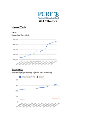 This document summarizes the internal and external IT tools used by the PCRF in 2014. It provides details on email and document collaboration usage, the patient database containing over 4,700 records, mobile data collection forms, and the CRM donor database. External tools discussed include the PCRF website, online advertising through Adwords, mass email marketing via Mailchimp, and the organization's social media presence including over 30 chapter-level accounts. It also mentions two university interns and their roles.