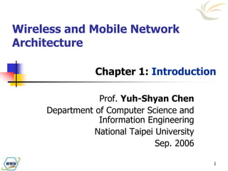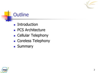This document provides an overview of wireless and mobile network architectures, including personal communication services (PCS). It discusses several cellular and cordless systems such as AMPS, GSM, IS-136, IS-95, DECT, PHS, and PACS. These systems use different multiple access techniques and spectrum to provide voice and data services connected to the public switched telephone network. The document also introduces third generation wireless systems that aim to support higher speeds and multimedia services.